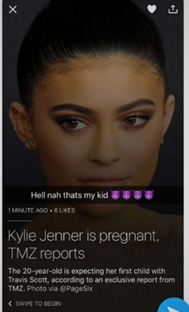 Ante estos rumores, Tyga el ex novio de la hermana de Kendall, utilizó Snapchat para decir que si Kylie está embaraza, el hijo es de él: “Diablos, no, ese hijo es mío”, mensaje que después de unos minutos fue eliminado de su historial.