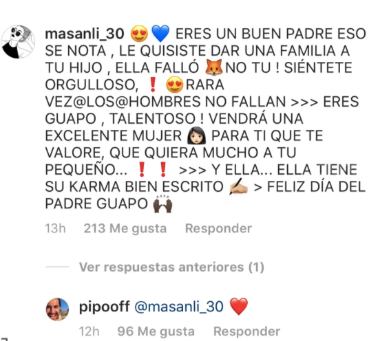 “Eres un buen padre, eso se nota. Le quisiste dar una familia a tu hijo, ella falló, no tú. Siéntete orgulloso. Eres guapo, talentoso, vendrá una excelente mujer para ti que te valore, que te quiera a ti y a tu pequeño. Ella tiene su karma bien escrito”, tras leer esas palabras, el ex de Michelle se limitó a responder con un corazón.
