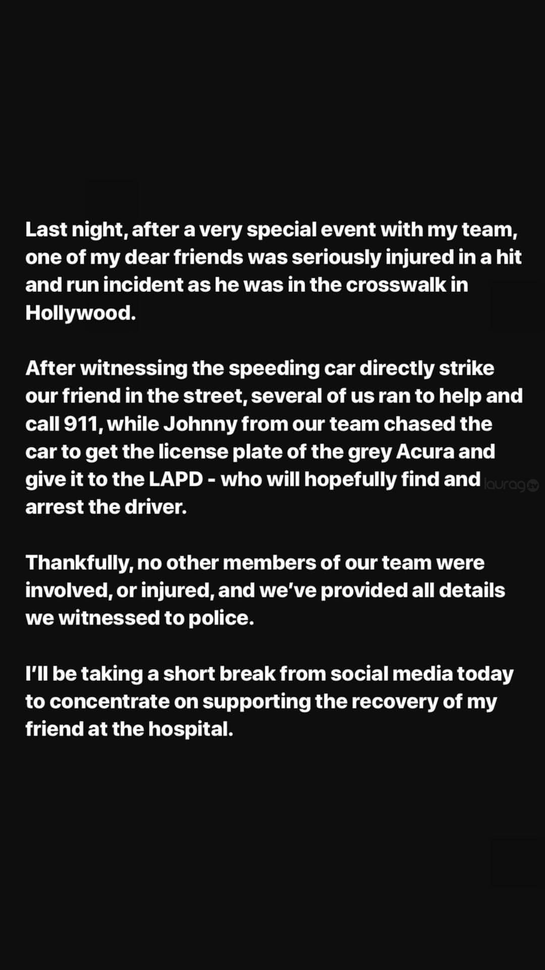 “Anoche, después de un evento muy especial con mi equipo, uno de mis queridos amigos resultó gravemente herido en un accidente mientras estaba en el paso de peatones en Hollywood. Después de que el auto en marcha golpera directamente a nuestro amigo en la calle, varios de nosotros corrimos a ayudar y llamamos al 911, mientras que Johnny de nuestro equipo persiguió el auto para obtener la placa del Acura gris y dárselo al LAPD, quien con suerte encontrará y arrestará al conductor. Afortunadamente, ningún otro miembro de nuestro equipo estuvo involucrado, ni resultó herido, y hemos proporcionado todos los detalles que atestiguamos a la policía. Hoy me tomaré un breve descanso de las redes sociales para concentrarme en apoyar la recuperación de mi amigo en el hospital”.