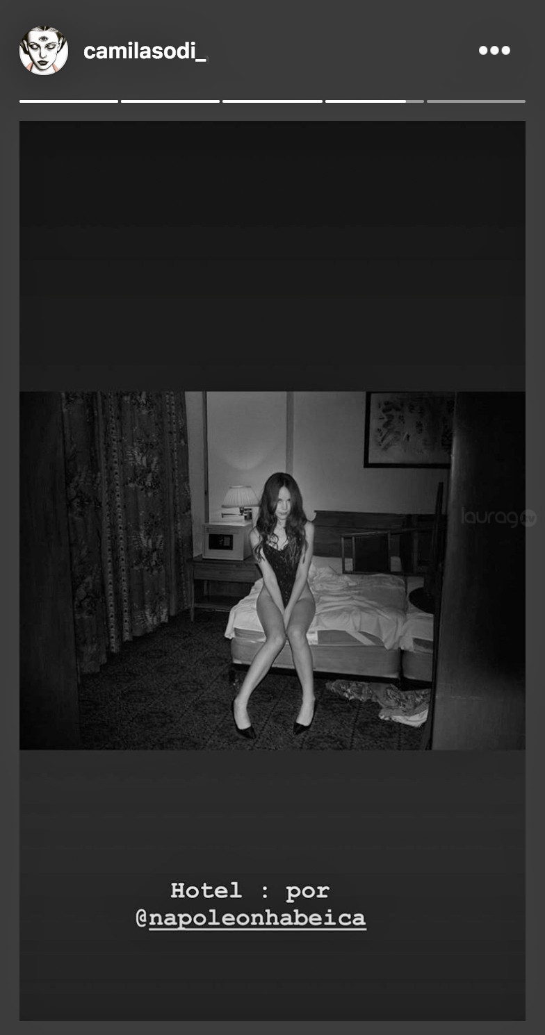 En la imagen aparece Camila sobre una mesa, puesta al revés encima de una cama.