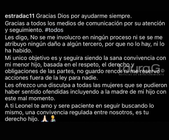 “Gracias Dios por ayudarme siempre. Gracias a todos los medios de comunicación por su atención y seguimiento. #todos. Les digo, No se me involucro en ningún proceso ni se se me atribuyo ningún daño a algún tercero, por que no lo hay, ni lo ha habido. Mi único objetivo es y seguirá siendo la sana convivencia con mi menor hijo, basada en el respeto, el derecho y obligaciones de las partes, no guardo rencor ni me reservo acciones fuera de la ley para nadie. A ti Leonel te amo y sere paciente en seguir buscando lo mismo, una convivencia regulada entre nosotros, es tu derecho hijo”,escribió Estrada en la descripción de la publicación.
