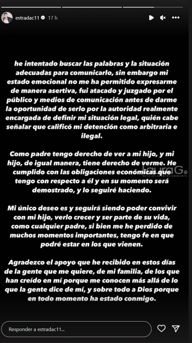 “He intentado buscar las palabras y la situación adecuadas (…) Como padre tengo el derecho de ver a mi hijo y mi hijo, de igual manera, tiene el derecho de verme. Mi único deseo es y seguirá siendo poder convivir con mi hijo, verlo crecer y ser parte de su vida como cualquier padre. Si bien, me he perdido de muchos momentos importantes, tengo fe en que podré estar en los que vienen (…) Agradezco el apoyo que he recibido de los que han creído en mí porque me conocen más allá de lo que la gente dice, y sobre todo a Dios porque en todo momento ha estado conmigo”, se lee en el comunicado.