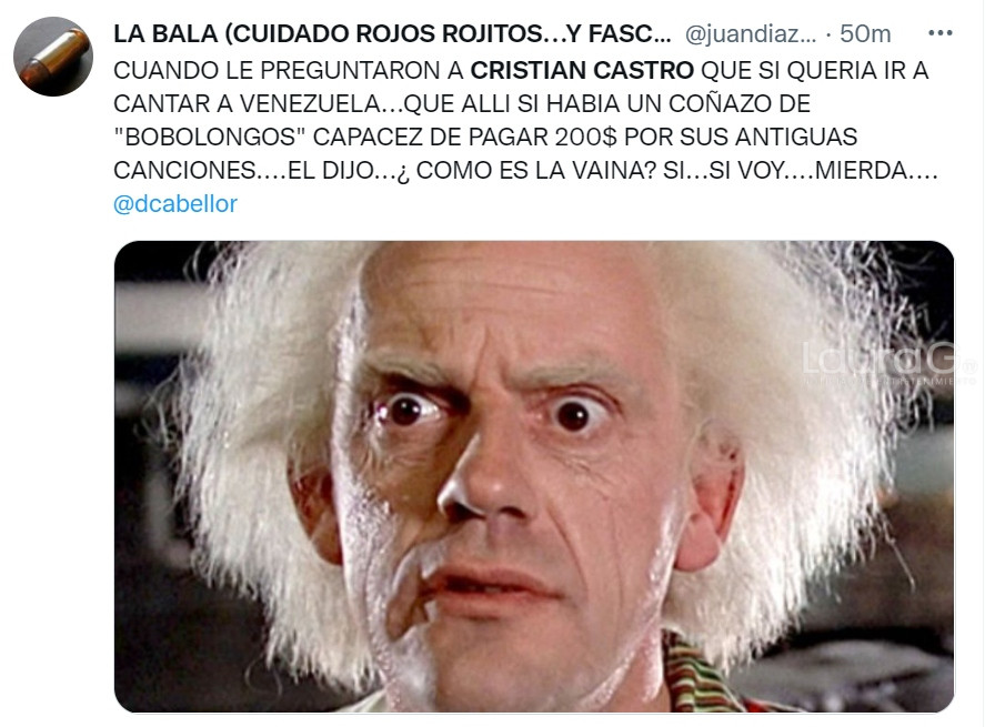 Usuarios de las redes sociales además de comparar al interprete de “Azul” con ‘Beetlejuice’, personaje que interpretó Michael Keaton en 1988, comenzaron a encontrarle parecido con el Doctor Emmett Brown de ‘Volver al Futuro’ interpretado por Christopher Lloyd.