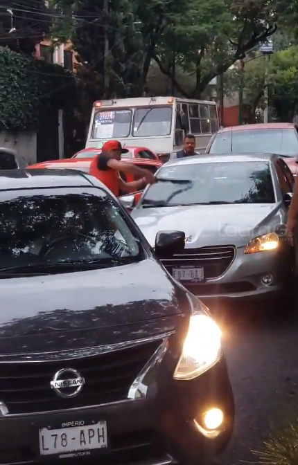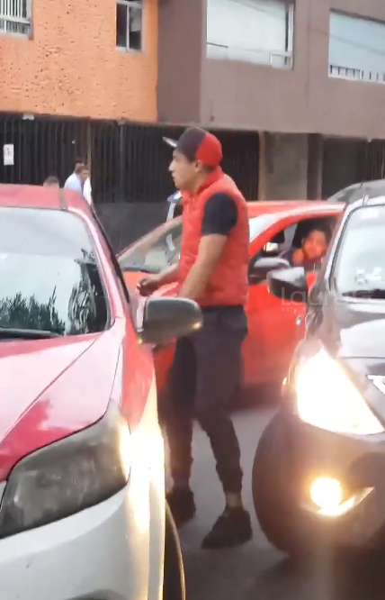 “Te voy a sacar a ver… vas a ver, wey”, grita el taxista. Después de algunas amenazas regresa a su unidad con placas A-59-435 ahí saca un tubo y regresa enojado a romper el vidrio del automóvil quien presuntamente lo chocó metros atrás.