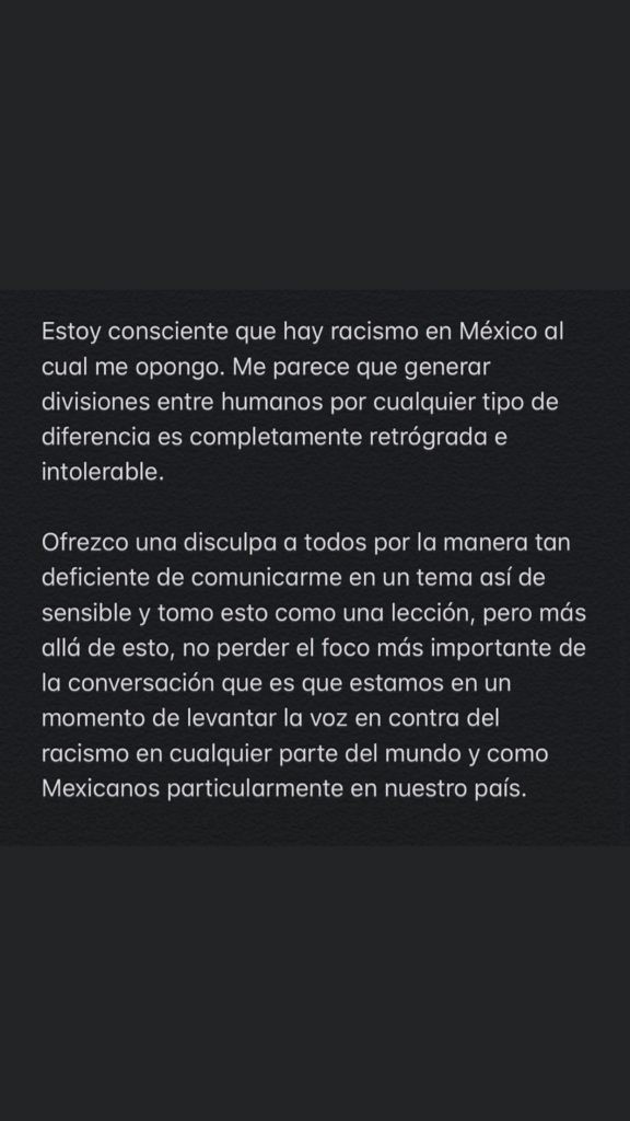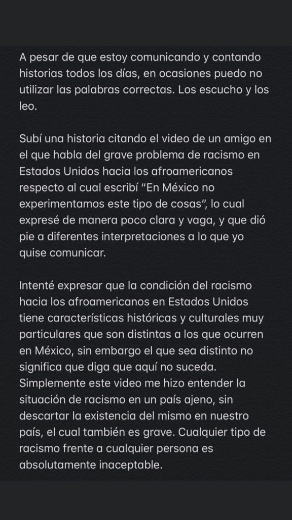 “Subí una historia citando el vídeo de un amigo en el que habla del grave problema de racismo en Estados Unidos hacia los afroamericanos (…) lo cual expresé de manera poco clara y vaga y dio pie a diferentes interpretaciones a lo que yo quise comunicar”, se lee en su mensaje.