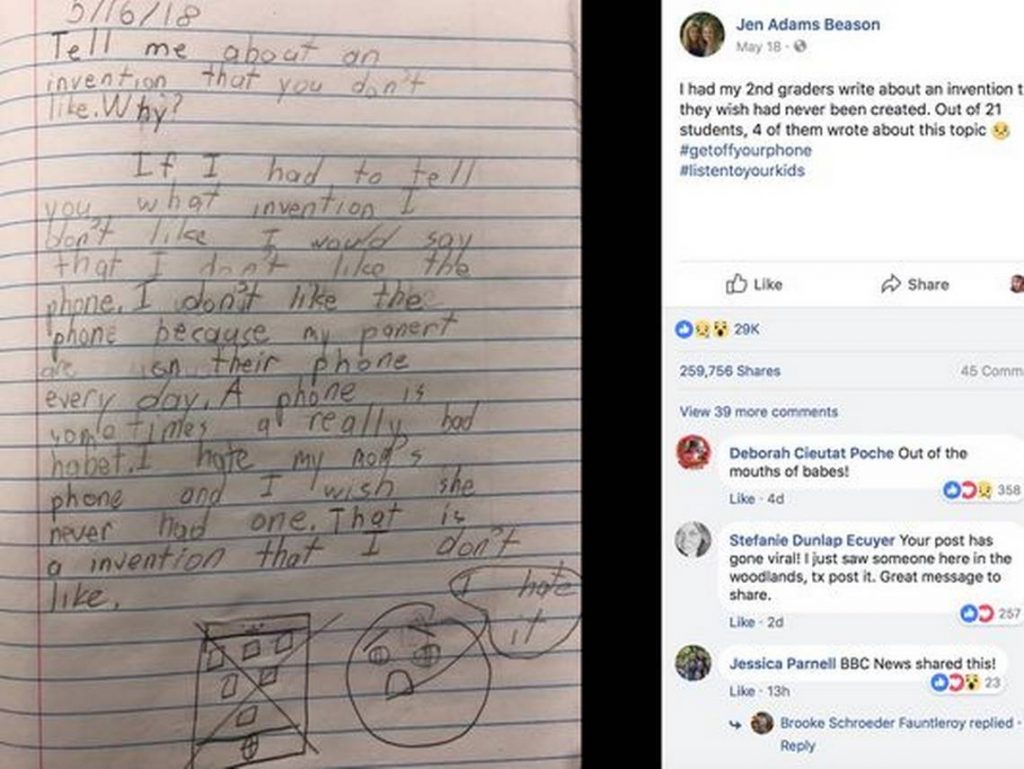 Las palabras de Jen Adams Beason estaban acompañadas de un dibujo de un celular y tenía al lado una cara triste, que logran captar el odio de la niña por estos aparatos.