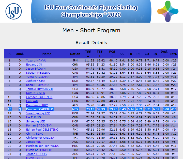 Los resultados del Campeonato fueron encabezados por Yuzuru Hanyu de Japon, con 111.82 puntos, mientras que Boyang Jin de China quedó en segundo lugar con 95.83 y Jason Brown de Estados Unidos con 94.71. Carrillo ocupó el sitio 13.