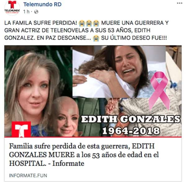 La falsa noticia comenzó a compartirse a través de Facebook, en una supuesta cuenta de Telemundo, en la cual señalaban que la actriz “había perdido la batalla contra el cáncer”. Inmediatamente sus fans comenzaron a escribirle en su cuenta de Instagram.