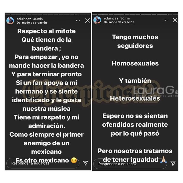 “Para empezar, yo no mande hacer la bandera.Y para terminar pronto, si un fan apoya a mi hermano se siente identificado y le gusta nuestra música, tiene mi respeto y mi admiración. Como siempre el primer enemigo de un mexicano, es otro mexicano”, declaró.
