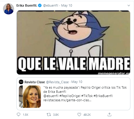 Este fin de semana Buenfil respondió a una nota que señalaba que Juan José Origel dijo que es pura “payasada” lo que hace en los vídeos que publica, lo cual dijo el conductor en el programa ‘Con permiso’ que se transmite por Unicable: “Ya no soy seguidor de ella, quiero mucho a Érika Buenfil, pero sus TikTok ya me tienen hasta…ya es mucha payasada”.