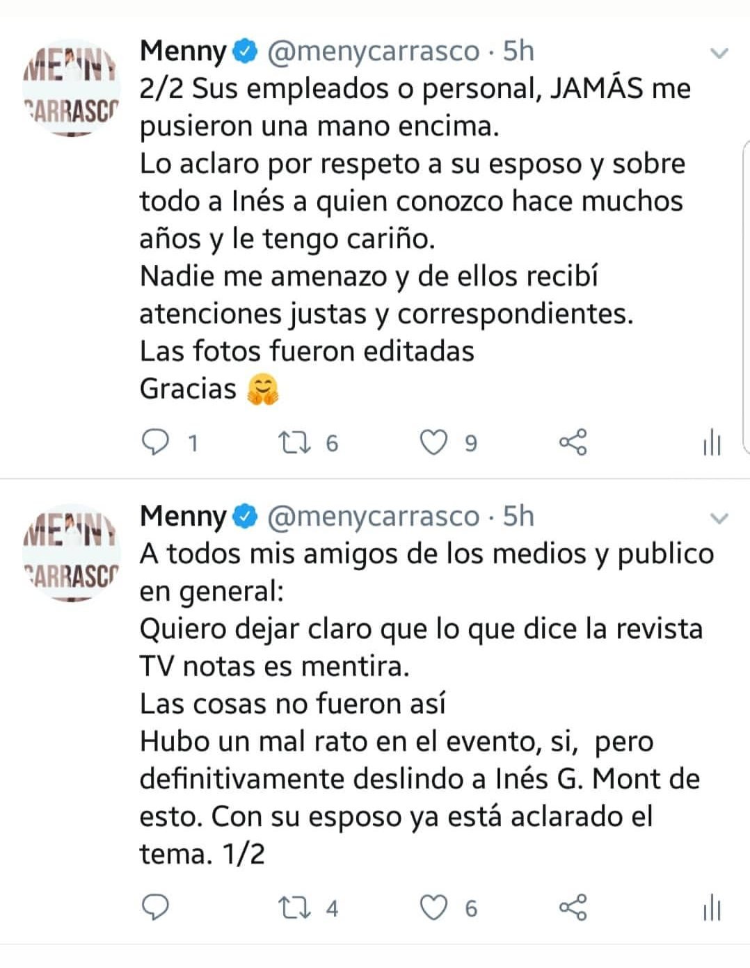 Luego de esta versión, Menny Carrasco utilizó su cuenta de Instagram, para aclarar que las fotos difundidas en la revista fueron editadas y que la seguridad de la familia, nunca le puso una mano encima, como se afirmaba.