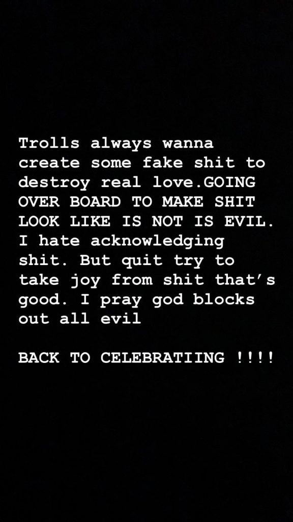 “Los haters siempre quieren crear algo falso para destruir el amor verdadero. Ruego a Dios que bloquee todo mal”, se lee al inicio de la historia, la cual por supuesto se refiere a los rumores de infidelidad, que aparentemente no existen.