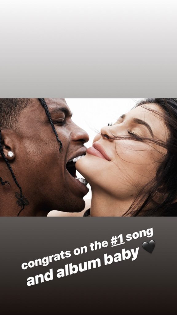 Además pese a los rumores de infidelidad, Kylie compartió con su ahora prometido, una nueva foto, con el fin de felicitarlo, ya que el álbum del rapero, se convirtió en número uno, logrando así una gran escalada en el mundo de la música.