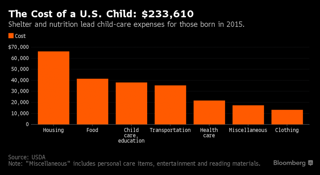 El costo de una familia para criar a un niño en el 2015 era de 233 mil 610 dólares, un 3% más que el año anterior, esto en gastos de una familia de clase media, pero las personas con ingresos más altos gastan el doble en sus hijos.