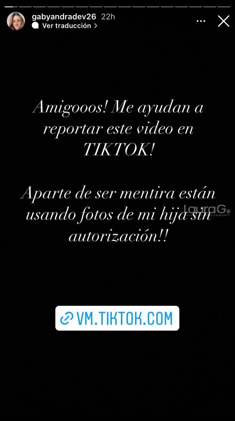 “Amigos, me ayudan a reportar este video en TikTok. A parte de ser mentira, están usando fotos de mi hija sin autorización”, se puede leer en la historia que compartió Gabriela en sus stories.