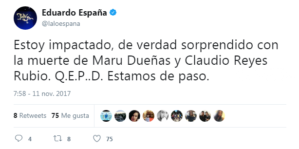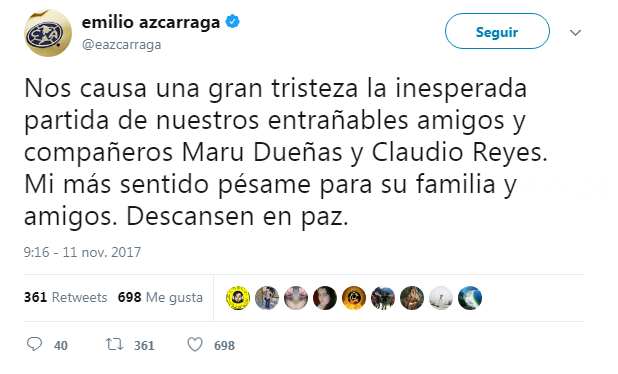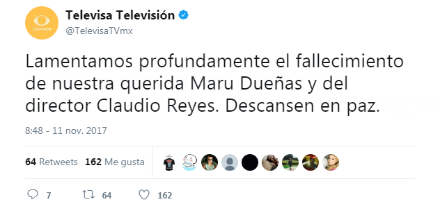 Ambos regresaban de grabar escenas de la telenovela ‘Me declaro culpable’. Emilio Azcarraga lamentó la pérdida de sus compañeros con un tuit: “Nos causa una gran tristeza la inesperada partida de nuestros entrañables amigos y compañeros Maru Dueñas y Claudio Reyes. Mi más sentido pésame para su familia y amigos. Descansen en paz.”