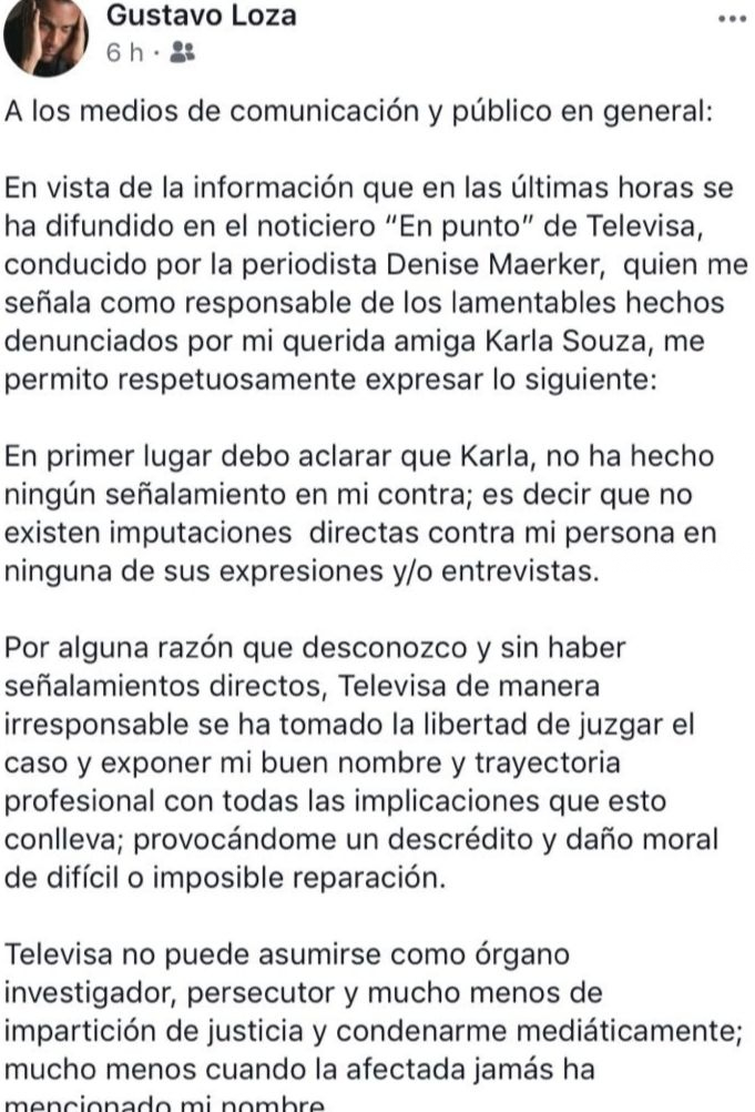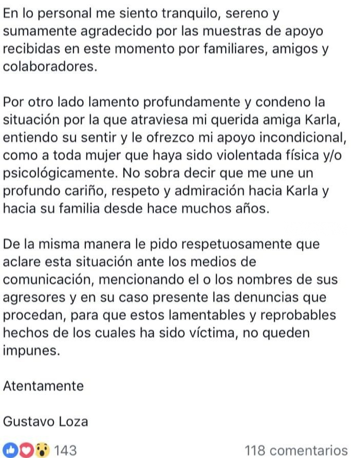 Por otro lado lamento profundamente y condeno la situación por la que atraviesa mi querida amiga Karla, entiendo su sentir y le ofrezco mi apoyo incondicional, como a toda mujer que haya sido violentada física y/o psicológicamente. No sobra decir que me une un profundo cariño, respeto y admiración hacia Karla y hacia su familia desde hace muchos años”, se lee en parte del comunicado que publicó en su cuenta de Facebook.