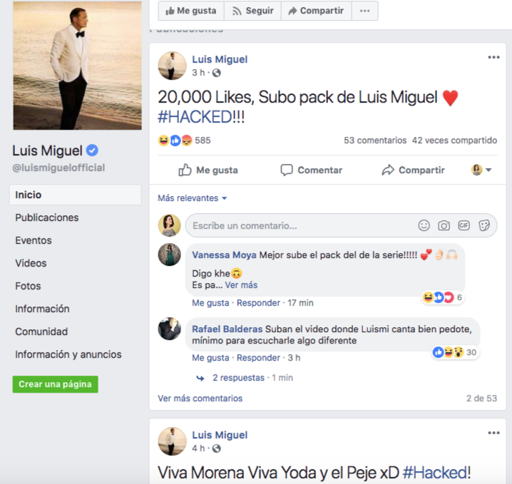 Aunque la cuenta ya fue recuperada, sin duda, los usuarios y fanáticos en Facebook se sorprendieron al ver el perfil oficial de Luis Miguel, hackeado hace unas horas y publicando algunos comentarios que fueron tomados con humor.