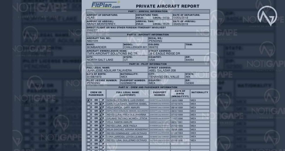 La aeronave Bombardier Challenger 601, con matrícula N601VH, tenía como destino llegar a Monterrey, Nuevo León y su origen era de Las Vegas, Nevada. De acuerdo a los primeros reportes las personas asistieron a la pelea de Saúl ‘El Canelo’ Álvarez.