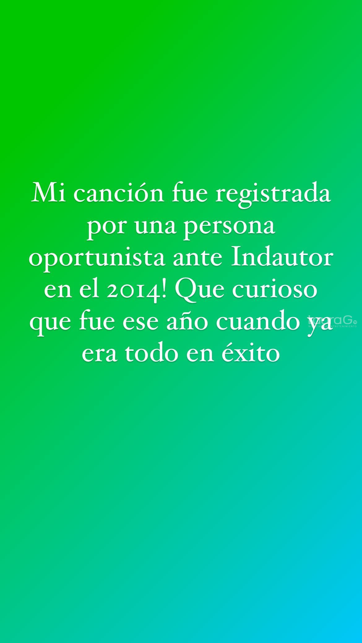 “¿Quién le quiere robar a quién? ¿Cuántos éxitos tiene él? A parte de la que me quiere robar? Ahora, porque en cuanto salió la canción no la registró, si según era de él? Fácil porque ahí la canción no valía nada. Cualuiera de los que me están leyendo pudo haber hecho lo mismo es decir tomar la canción del disco de Ms llegar a Indautor y decir “es mi canción” porque Indautor registra de buena fe. Y ahí es donde llegan los oportunistas y estafadores a querer robarles a los que si trabajamos duro y honradamente. Pero espero y confío en Dios en que todo se aclare. Gracias a todos por su cariño y apoyo los quiero. Incluso cualquier duda o pregunta háganmela saber, el que nada debe nada teme”, escribió el autor.