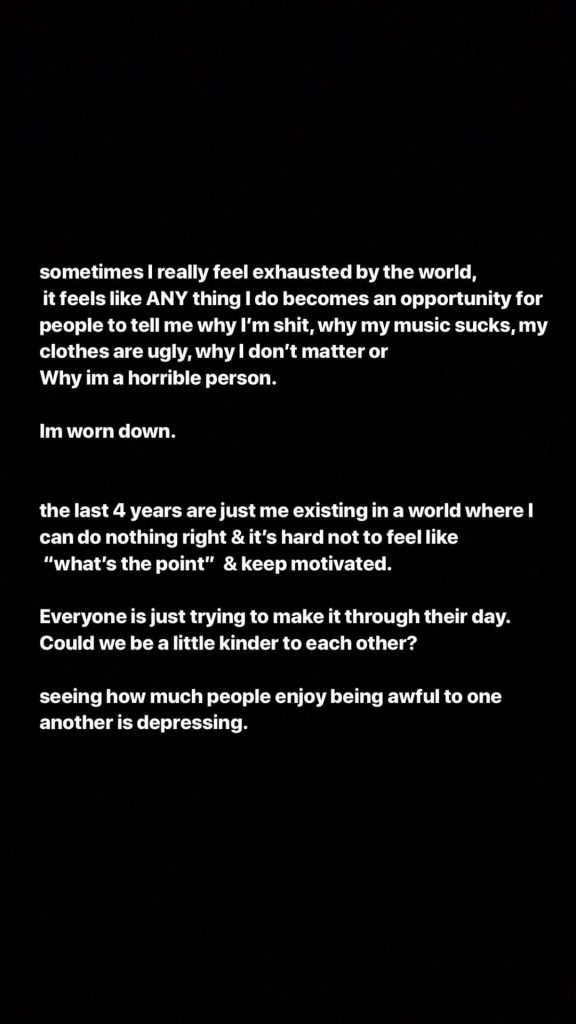 Más tarde, se dijo cansada del mundo en el que se desenvuelve, “parece que todo lo que hago es una oportunidad para que la gente me diga que soy una porquería, que mi música apesta, que mi ropa es horrible, que no importo y que soy una persona horrible.”