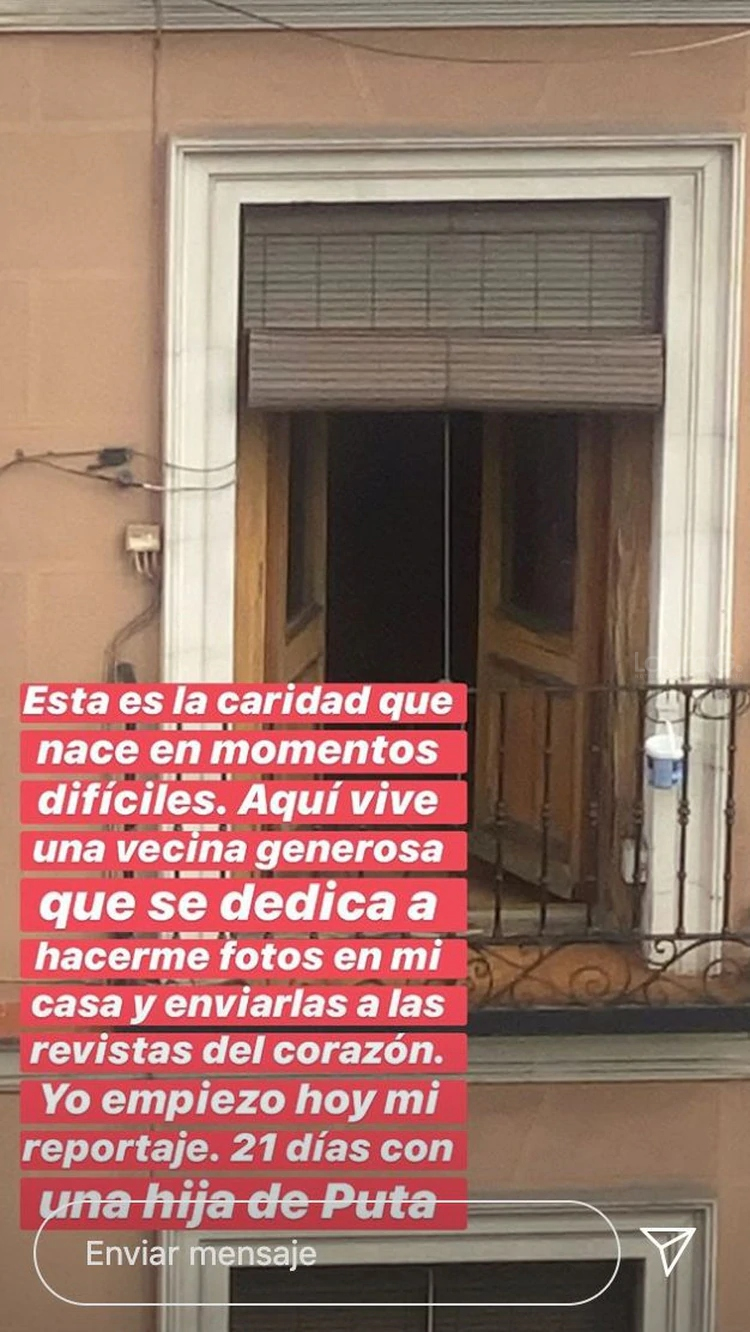 “Esta es la caridad que nace en momentos difíciles. Aquí vive una vecina generosa que se dedica a hacerme fotos en mi casa y enviarlas a las revistas del corazón. Yo empiezo hoy mi reportaje. 21 días con una hija de p***”.