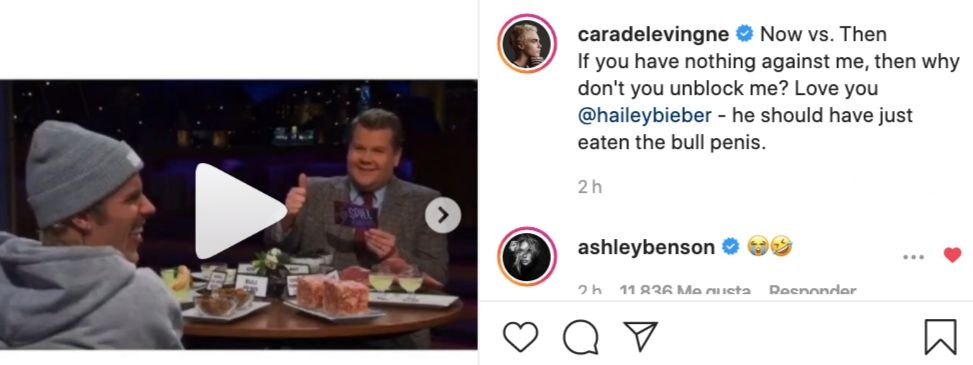 Pero lejos de quedarse allí, Cara utilizó el vídeo para compartir una serie de imágenes y preguntarle a Justin, que sí no tiene nada en su contra, por qué la tiene bloqueada de todas sus redes sociales. Envió un cariñoso mensaje para Hailey y le recomendó a Justin que tenía que comer pene de toro, en esa pregunta.