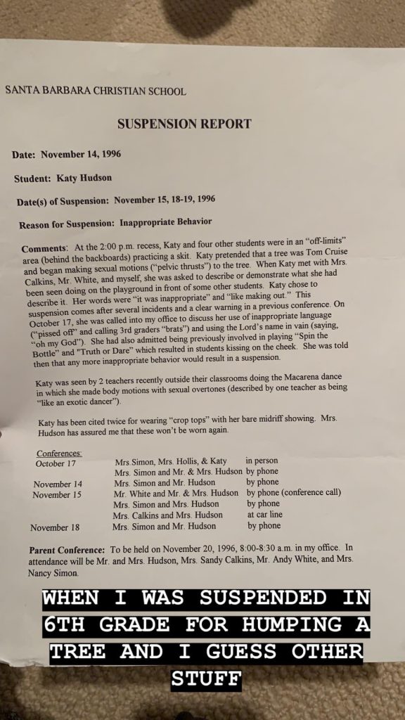 Su mamá leyó la carta de suspensión en las historias de Instagram de la cantante y por supuesto, recordaron este bochornoso momento para la Katy de sexto grado.