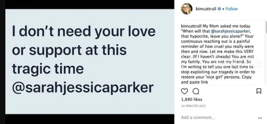 “No necesito tu amor o apoyo en este trágico momento, Sarah Jessica Parker. Tus continuas menciones hacia mí son un doloroso recordatorio de cuán cruel fuiste y eres conmigo”.