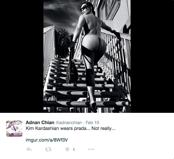 Se trata de una campaña de Prada, publicada de manera exclusiva en la revista Love, cuya edición salió a la venta el pasado 9 de febrero. Sin embargo, las fotografías han sido criticadas por los amantes de la marca, quienes consideran las imágenes como “vulgares”, debido a los desnudos frontales y poses de Kim.