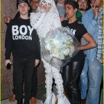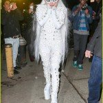 Su disfraz era un traje blanco que cubría todo su cuerpo, un tocado en la cabeza unido a unos lentes obscuros, una larga peluca color blanco estilo ‘Rapunzel’ y unas plataformas enOOOrmes del mismo tono.