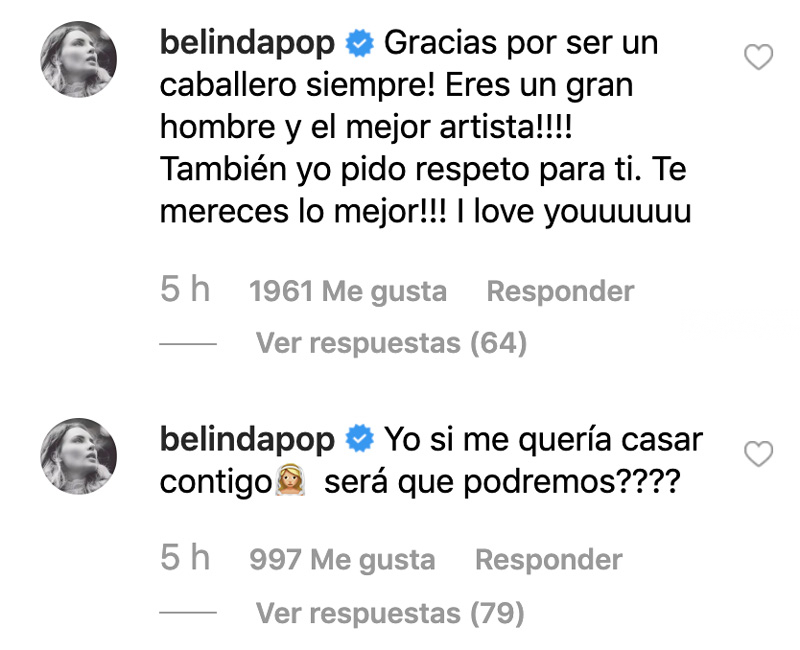 La declaración fue agradecida por Belinda en los comentarios y resaltó que Lupillo es un verdadero caballero y además lejos de confirmar que no hay boda como lo hizo el cantante, afirmó que ella si quería casarse con él.