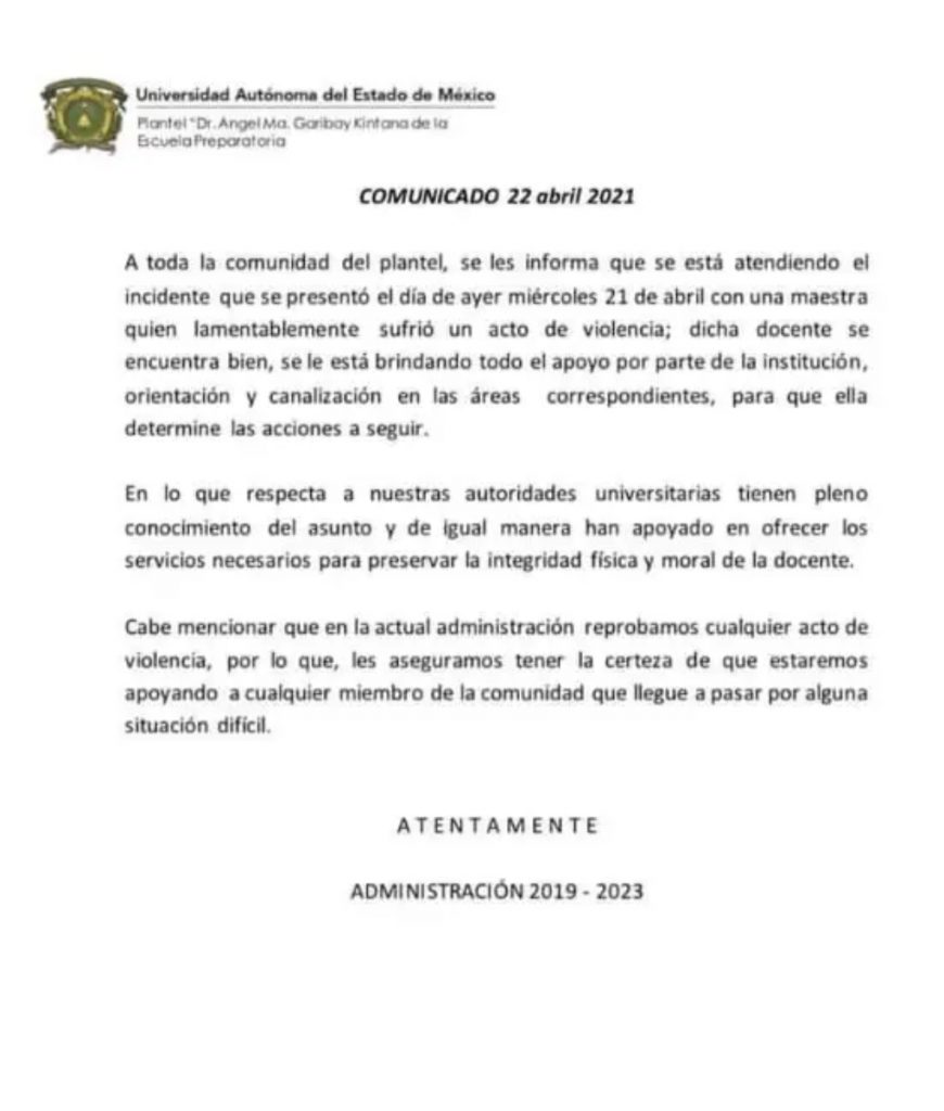 Se trata de una profesora de la Prepa 5, plantel ‘Dr. Angel María Garibay’ ubicada en Toluca y perteneciente a la Universidad Autónoma del Estado de México (UAEMex) quien mientras impartía su clase en línea fue interrumpida por un hombre que la agredió.