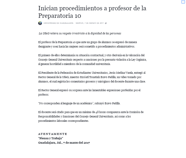 Por su parte la Universidad emitió el siguiente comunicado a través de la cuenta de Facebook donde aclaran que ya iniciaron procedimientos contra el profesor debido a que “no corresponde al lenguaje de un académico”: