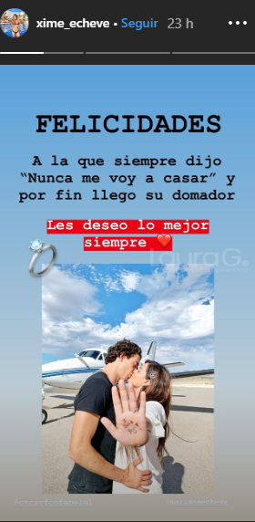 A través de las historias del portero del América compartió algunas felicitaciones de las personas más cercanas a la pareja, entre ellas Ximena Echeverría, hermana de la conductora, aseguró que Mariana siempre había dicho que jamás se casaría.