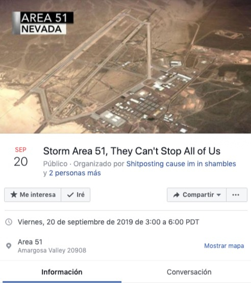 A ver, resulta que se ha creado un evento en Facebook donde más de 300.000 personas han confirmado participar. En él aseguran que el 20/09 “asaltarán” el #Area51 para descubrir lo que sucede dentro en realidad y que “no pueden detenernos a todos”.