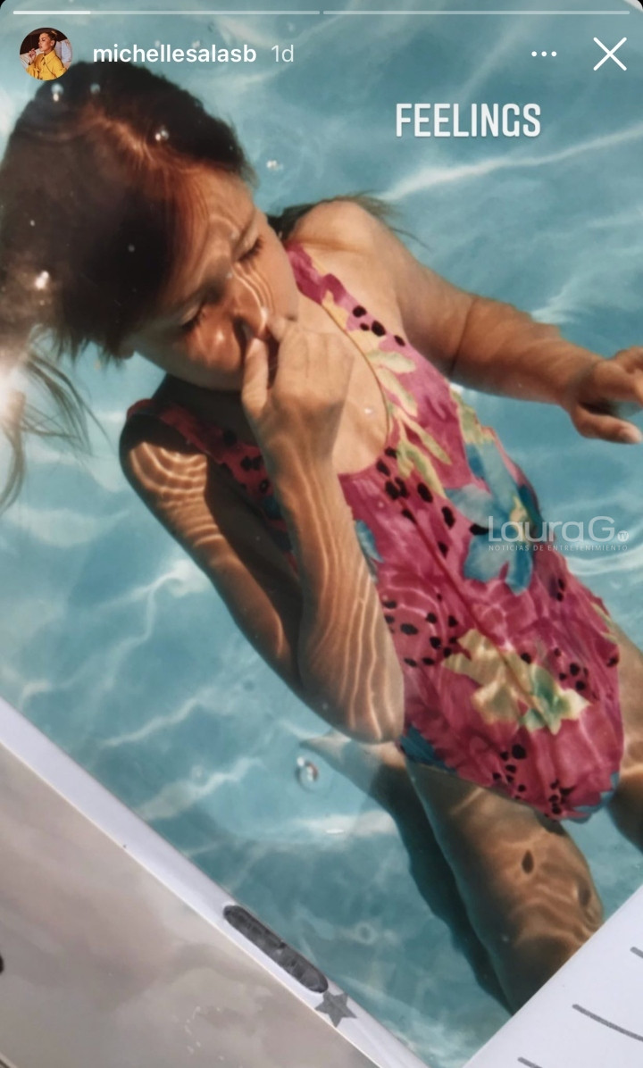 En la fotografía aparece Michelle Salas quien aparece sumergida en una alberca tapándose la nariz y en la postal incluyó la leyenda “Feelings” que en español significa  “Sentimientos”.