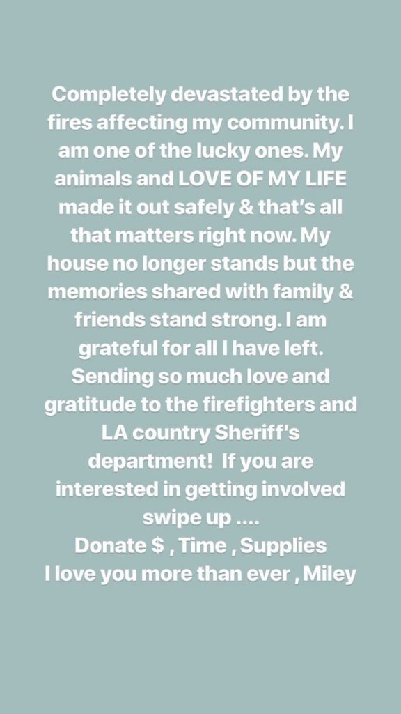 Miley Cyrus utilizó su cuenta de Instagram para informar a sus seguidores que fue una de las afectadas por los incendios forestales en California, lugar donde perdió oficialmente la casa que compartía junto a Liam Hemsworth.