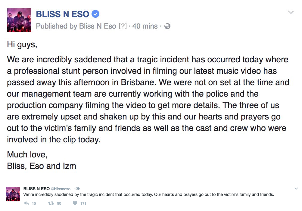 “Estamos muy apenados por el trágico incidente que ocurrió hoy, donde un doble profesional que participaba en el rodaje de nuestro último vídeo ha muerto esta tarde en Brisbane. Nosotros no nos encontrábamos en la locación y nuestro manager y equipo están trabajando con la policía y la producción que estaba a cargo de grabar el video. Estamos muy enojados y sorprendidos por esto y nuestros corazones y oraciones están con la familia y amigos de la víctima así como con el equipo que estuvo involucrado en el clip de hoy. Bendiciones, Eso y lzm”, se lee en la publicación del grupo en sus redes sociales.