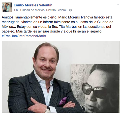 “Amigos, lamentablemente es cierto. Mario Moreno Ivanova falleció esta madrugada, víctima de un infarto fulminante en su casa de la ciudad de México…Estoy con su viuda, la Sra. Tita Marbez en las cuestiones del papeleo. Más tarde les avisaré dónde y a qué hr serán el sepelio”.