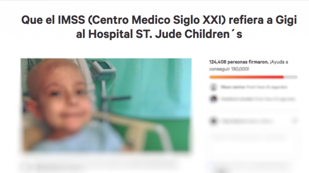 Desde hace dos días, sus padres iniciaron una recaudación de firmas en Change.org donde se han logrado recolectar más de 124 mil, con el fin de que el IMSS libere el expediente del caso de Gigi para que pueda ser evaluado por el hospital ST Jude Children’s.