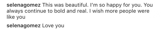 Tras esta declaración, sus fanáticos se han emocionado, pero el sentimiento fue doble, cuando vieron que su amiga Selena Gomez, apareció en Instagram para dedicarle algunas palabras: “Fue hermoso. Estoy muy feliz por ti. Continúas siento tan fuerte y real. Deseo que mucha gente sea como tú. Te amo”.