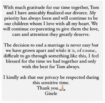 “Con mucha gratitud por nuestro tiempo juntos, Tom y yo hemos finalizado amistosamente nuestro divorcio. Mi prioridad siempre ha sido y seguirá siendo nuestros hijos a los que amo con todo mi corazón. Nosotros continuaremos con la crianza conjunta para darles el amor, cuidado y atención que tanto merecen. La decisión de terminar un matrimonio nunca es fácil pero hemos crecido separados y aunque es, por supuesto, difícil pasar por algo así, me siento bendecida por el tiempo que hemos pasado juntos y sólo deseo lo mejor para Tom siempre. Pido amablemente que se respete nuestra privacidad durante este momento tan delicado. Gracias”, compartió Gisele a través de una historia breve de Instagram.