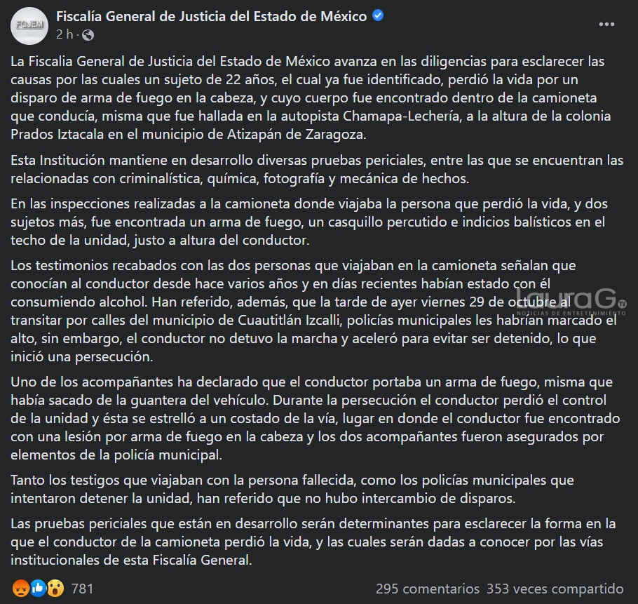 Hace un par de horas la Fiscalía General de Justicia del Estado de México compartió un comunicado de prensa para esclarecer el caso de Octavio Ocaña, quien conducía en la autopista Chamapa-Lechería, a la altura de la colonia Prados Iztacala en el municipio de Atizapán de Zaragoza.
