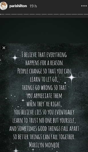 Además Hilton ‘confirmó’ la noticia al borrar todas las imágenes junto a su ex prometido, con quien no compartía una sola fotografía junto a Chris desde septiembre. Y su más reciente historia de Instagram muestra la actitud con la que ha tomado esta decisión