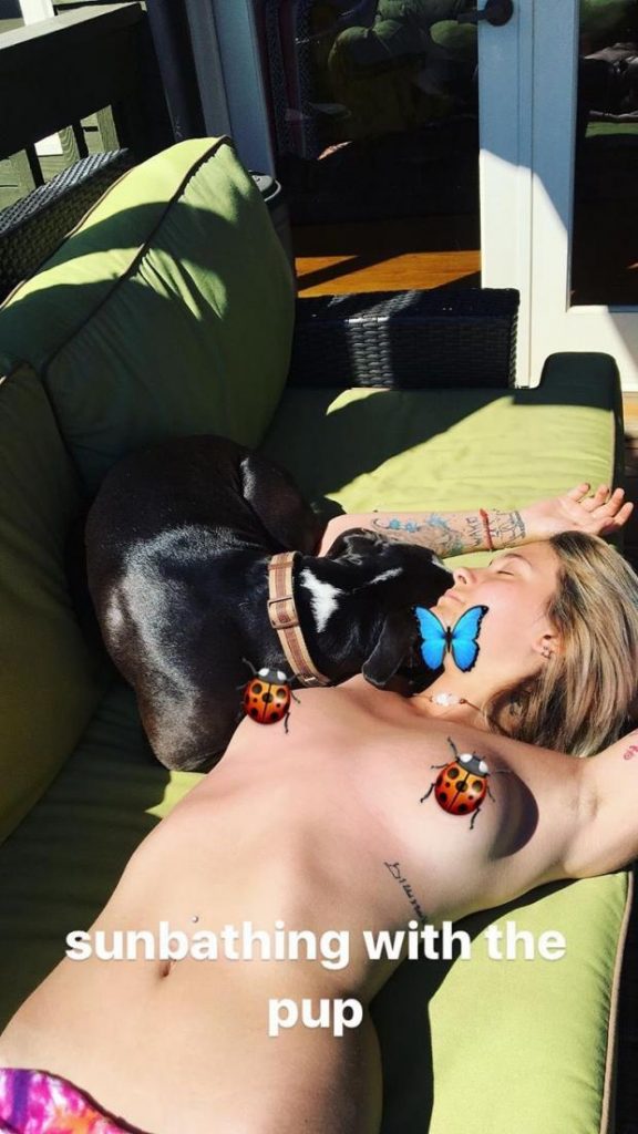 El día de hoy sorprendió a sus seguidores en Snapchat al compartir una imagen de ella completamente desnuda y cubierta en la parte de abajo, en la fotografía está acompañada por un cachorro y dos emojis en sus pezones.