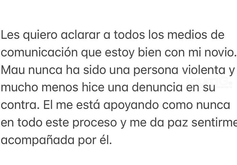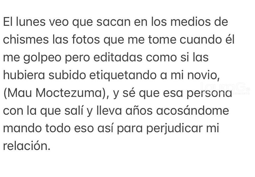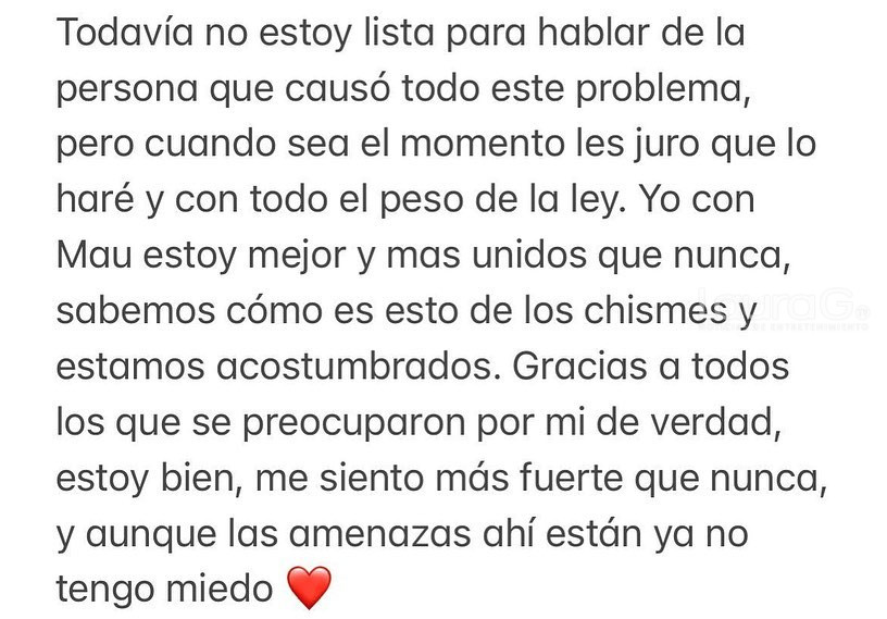 “Siento que tengo que aclarar esto ya, hace 3 años fui víctima de violencia por una persona con la que salí y que no voy a mencionar aún por el proceso legal. Hace 2 años subí un post exhibiendo los golpes que él en su momento me llegó a dar y lo borré después. Esta persona se enojó y empezó a amenazarme con compartir unos videos míos, lleva años acosándome de diferentes cuentas de Instagram y en una de sus amenazas dijo que iba a acabar con mi relación con Mau”, inició la publicación.