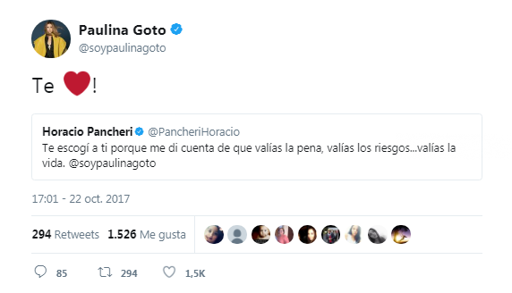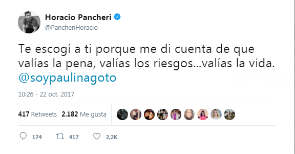 Fue por medio de su cuenta de Twitter que el actor comenzó la conversación donde abrió su corazón con un contundente mensaje: “Te escogí a ti porque me di cuenta de que valías la pena, valías los riesgos…valías la vida. @soypaulinagoto”.
