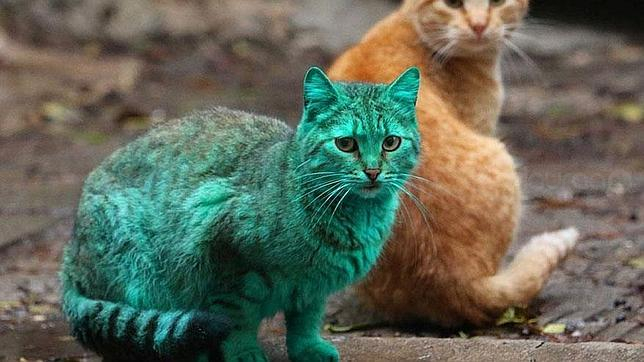 Pero no es el único caso con mascotas de un color bastante peculiar, ya que recientemente en Bulgaria, se descubrió que uno de los gatos que transitaban por el barrio de Varna, poseía un color verde intenso.