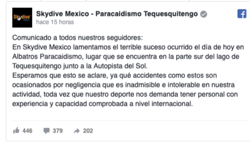 A través de sus redes sociales, Skydive México lamentó la muerte de las dos personas, confirmando el nombre de la empresa que tuvo este terrible accidente, este mensaje desató cientos de críticas para todos los amantes del paracaidismo.
